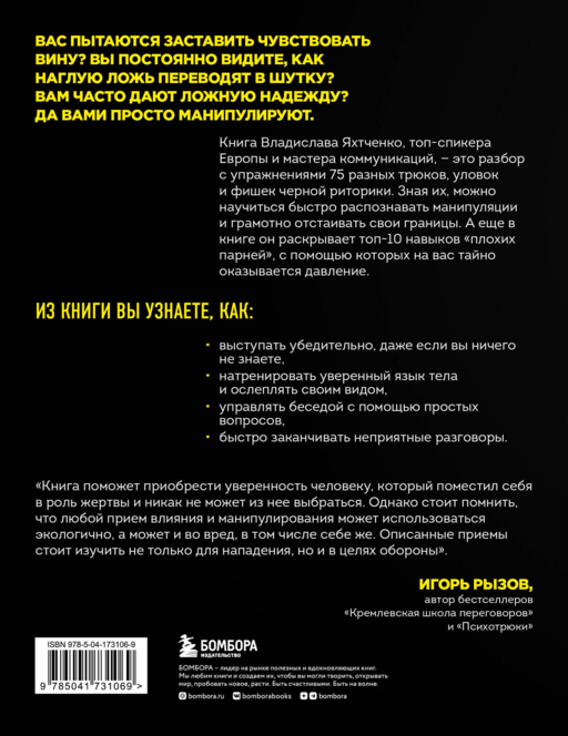Книга Владислава Яхтченко, топ спикера Европы и мастера коммуникаций, — это разбор с упражнениями 75 разных трюков, уловок и фишек черной риторики. Зная их, можно научиться быстро распознавать манипуляции и грамотно отстаивать свои границы. А еще в книге он раскрывает Топ-10 навыков «плохих парней», с помощью которых на вас тайно оказывается давление.