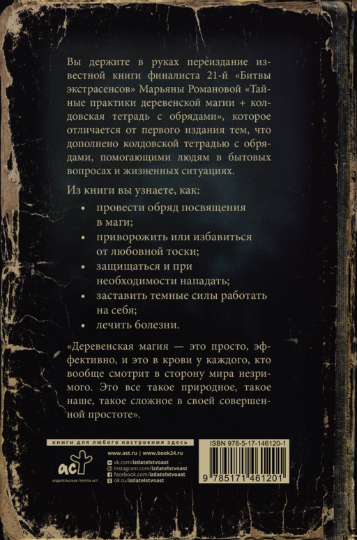 Вы держите в руках переиздание известной книги финалиста 21-й «Битвы экстрасенсов» Марьяны Романовной «Тайные практики деревенской магии + колдовская тетрадь с обрядами», которая отличается от первого издания тем, что она дополнена колдовской тетрадью с обрядами, помогающими людям в бытовых вопросах и жизненных ситуациях.