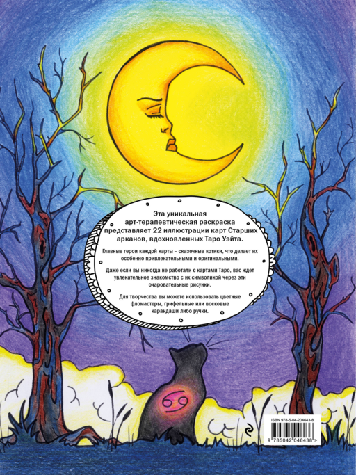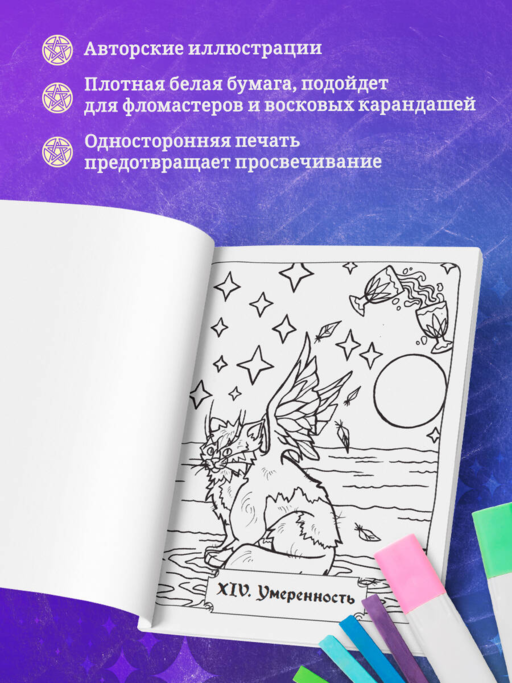 Отлично проработанные изображения помогут вам не только снять стресс, но и лучше познакомиться с символикой Таро. Плотная белая бумага обеспечивает комфортное раскрашивание любыми материалами — от цветных фломастеров до грифельных и восковых карандашей. На одном развороте располагается только одна картинка, что предотвратит просвечивание на другой рисунок.