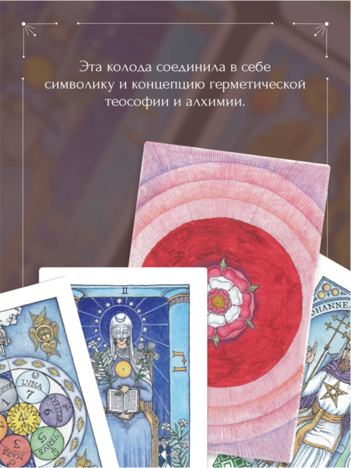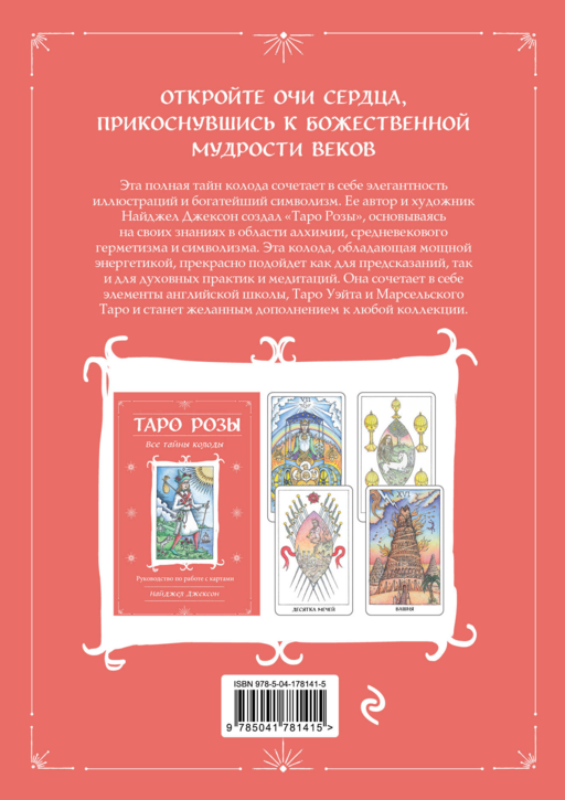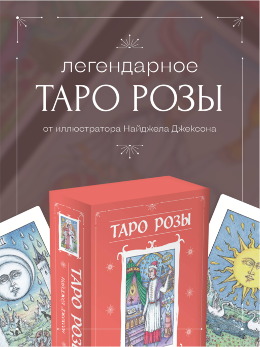 «Таро розы» Найджела Джексона — колода, созданная под влиянием образов и символов алхимии, средневекового герметизма и символизма. Она сочетает в себе элементы и традицию Таро Уэйта со средневековым очарованием Марсельского Таро. Работая с ней, вы исследуете куртуазные тайны рыцарства и любви, секреты каббалы и алхимии, а также духовную функцию символов Таро, которые являются вратами в пространство между материальной и духовной сферами. Это Таро с мощной энергетикой подойдет для предсказаний и духовных практик.