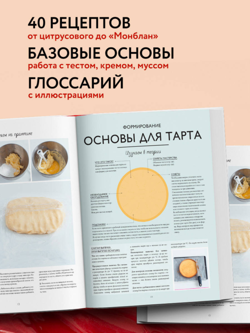 Книга — мастер-класс! Авторы выбрали базовые рецепты для начала: тесто и бисквиты, кремы, ганаш и карамель, меренги, муссы и глазури. Это то, что является основой каждого тарта. Далее, когда освоена база, предлагаются классические рецепты: тарты с фруктами и ягодами, сопровождаемые шоколадом, карамелью или ванилью. И в конце дан иллюстрированный глоссарий: декор, нарезки фруктов, кухонные принадлежности и оборудование, основные техники и приемы. Каждый рецепты делится на две части: «изучаем в теории» (схема изделия с объяснениями), «применяем на практике» (пошаговые фото и приготовление). Все процессы досконально разобраны и наглядно показаны. После знакомства с книгой вы выходите с ощущением, что побывали на настоящем мастер-классе и стали настоящими профи в создании тартов.
