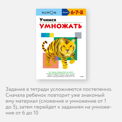 Рабочая тетрадь "Учимся умножать" — продолжение тетради "Учимся умножать. Простые примеры". С ней ваш ребёнок будет развивать полученные ранее навыки и научится решать более сложные задачи. Постепенно, выполняя упражнения на повторение пройденного, разбирая новые темы и закрепляя изученный материал на практике, он освоит умножение чисел от 6 до 10.