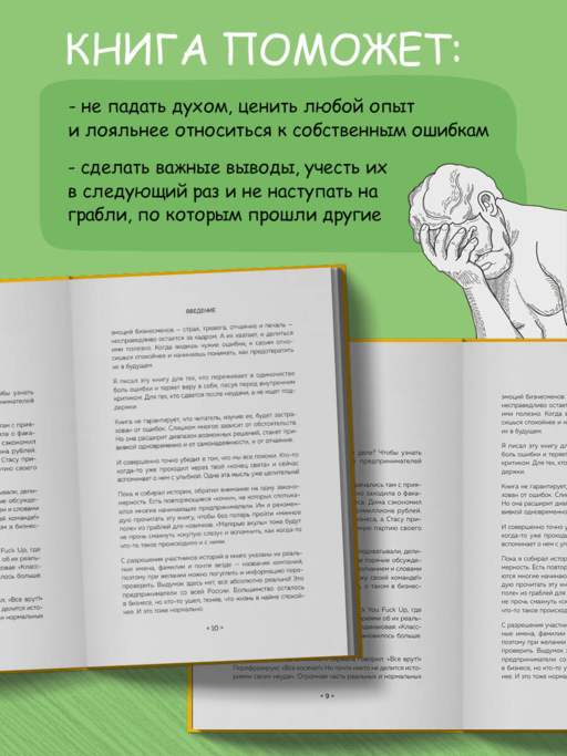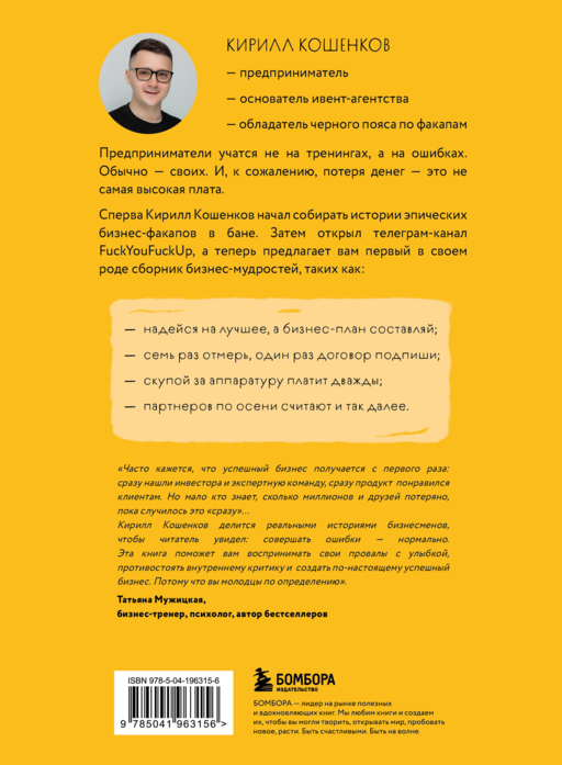 Предприниматели учатся не на тренингах, а на ошибках. Обычно — своих. И, к сожалению, потеря денег — это не самая высокая плата. Сперва Кирилл Кошенков начал собирать истории эпических бизнес-факапов в бане. Затем открыл телеграм-канал FuckYouFuckUp, а теперь предлагает вам первый в своем роде сборник бизнес-мудростей, таких как: