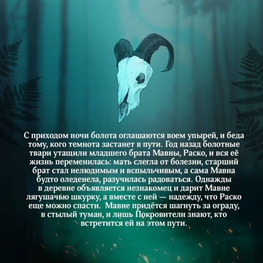 В топях сгинул младший брат Мавны, Раско. Туда ведёт её лягушачья шкурка, подаренная незнакомцем.