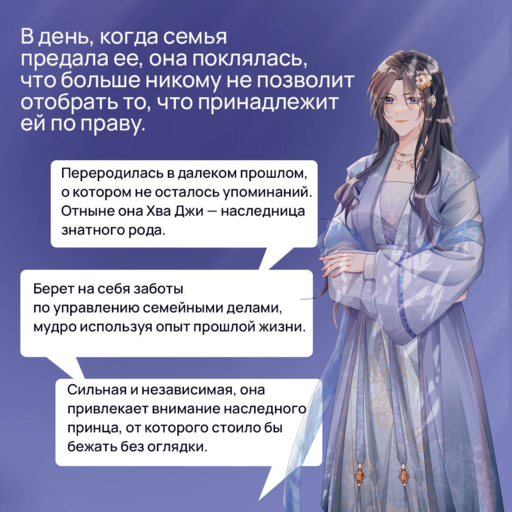 Отныне она Хва Джи — наследница знатного рода. Девушка надеялась, что интриги и предательства остались позади, но в одно мгновение семья Хва распалась, а мужчины оказались в изгнании по приказу императора. Хва Джи берет на себя заботы по управлению семейными делами, мудро используя опыт прошлой жизни. Сильная и независимая, она привлекает внимание того, от кого бы стоило бы бежать без оглядки.