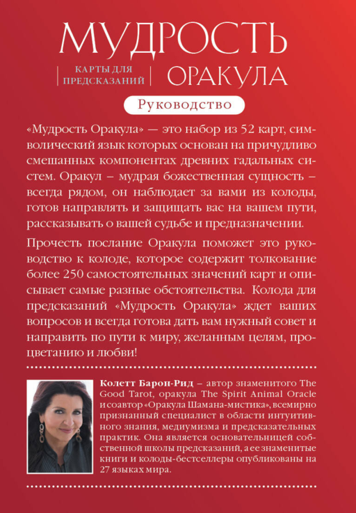 Колетт Барон-Рид — автор знаменитого The Good Tarot, оракула The Spirit Animal Oracle и соавтор «Оракула Шамана-мистика», всемирно признанный специалист в области интуитивного знания, медиумизма и предсказательных практик. Она является основательницей собственной школы предсказаний, а ее знаменитые книги и колоды-бестселлеры опубликованы на 27 языках мира.