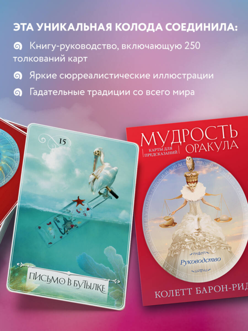 Колода «Мудрость оракула. Карты для предсказаний» от Колетт Барон-Рид, автора знаменитого The Good Tarot, оракула «Духи животных» и соавтора «Оракула Шамана-мистика» — это причудливое переплетение И-Цзин, скандинавских рун, Таро и других древних предсказательных систем. Оракул — мудрая божественная сущность — всегда рядом, он наблюдает за вами из колоды, готов направлять и защищать вас на вашем пути, рассказывать о вашей судьбе и предназначении.