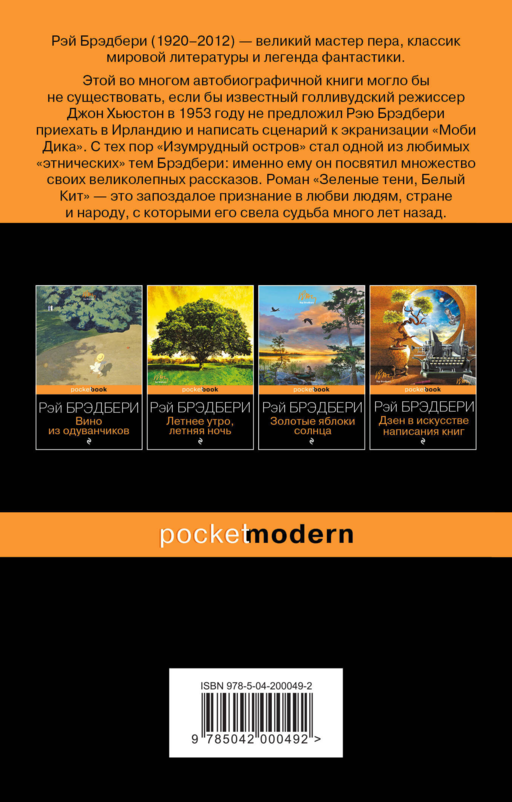 «Зеленые тени, Белый Кит». Этой во многом автобиографичной книги могло бы не существовать, если бы известный голливудский режиссер Джон Хьюстон в 1953 году не предложил Рэю Брэдбери приехать в Ирландию и написать сценарий к экранизации «Моби Дика». С тех пор «Изумрудный остров» стал одной из любимых «этнических» тем Брэдбери: именно ему он посвятил множество своих великолепных рассказов.