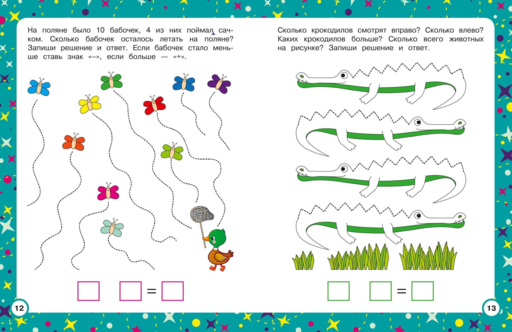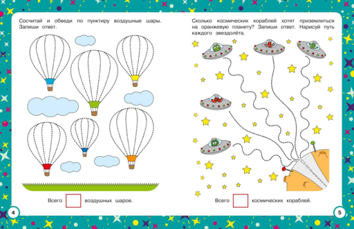 Занимаясь, ребёнок будет обводить по пунктиру, считать, писать цифры, сравнивать предметы по количеству и соотносить количество с числом, решать простые задачи на сложение и вычитание.