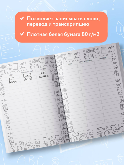 Большой словарный запас — ключ к общению на иностранном языке. Стильная и удобная тетрадь предназначена для записи любых иностранных слов, блок содержит три столбика: для слов на иностранном, их транскрипций и перевода. Качественная белая бумага, стильное внутреннее и внешнее оформление, удобная структура блока, — всё создано для приятного и эффективного использования! Подходит для занятий в школе, а также самостоятельного обучения. Для школьников и взрослых!