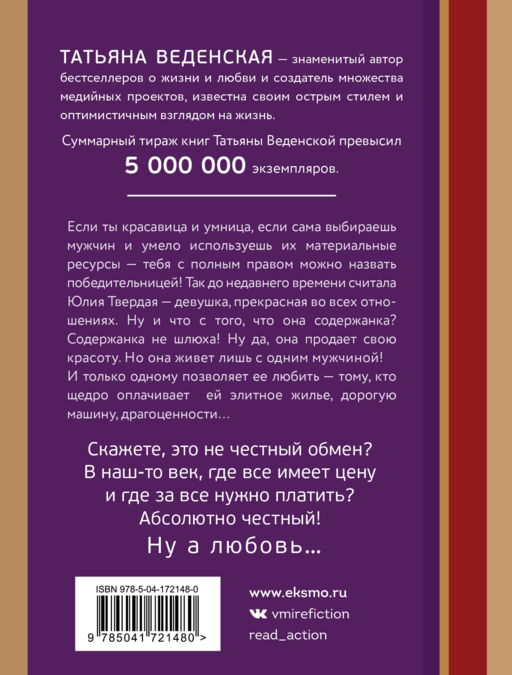 Если ты красавица и умница, если сама выбираешь мужчин и умело используешь их материальные ресурсы — тебя с полным правом можно назвать победительницей! Так до недавнего времени считала Юлия Твердая — девушка, прекрасная во всех отношениях. Ну и что с того, что она содержанка? Содержанка — не шлюха! Ну да, она продает свою красоту. Но она живет лишь с одним мужчиной! И только одному позволяет ее любить — тому, кто щедро оплачивает ей элитное жилье, дорогую машину, драгоценности… Скажете, это не честный обмен? В наш-то век, где все имеет цену и где за все нужно платить? Абсолютно честный! А любовь…