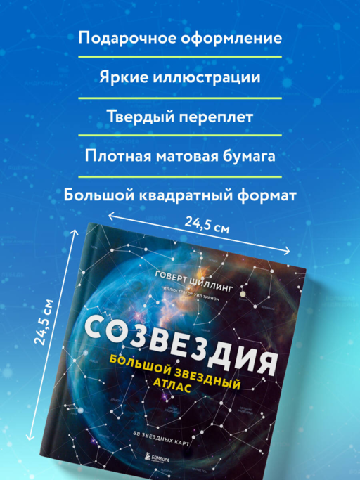 Звёздный гид от легендарных авторов: писателя-астронома Говерта Шиллинга и картографа Уила Тириона — создателя самых точных звёздных карт XX века. Яркие, чёткие иллюстрации и продуманная структура позволяют легко ориентироваться среди 88 созвездий. Лаконичные описания и интересные факты о событиях, происходивших в зоне каждого созвездия, пробуждают истинное любопытство и интерес к исследованию темы космоса.