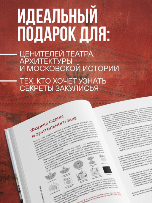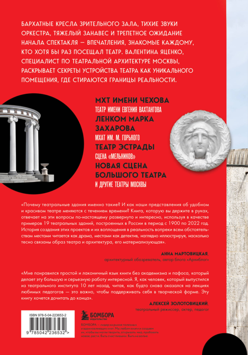 Эта книга — о театрах и о Москве, о том, как самый социальный вид искусства живет на столичных сценах. Валентина Яценко, редактор, долгое время сотрудничающая с театрами Москвы, рассказывает о том, как здание театра с его фасадами, колоннами, фальш-окнами, ложами, лепниной или аскетичной кирпичной кладкой, не просто служит фоном для игры актеров, но вступает в активный диалог с каждым, кто переступает его порог. Именно так само пространство театра становится частью взаимодействия со зрителем.