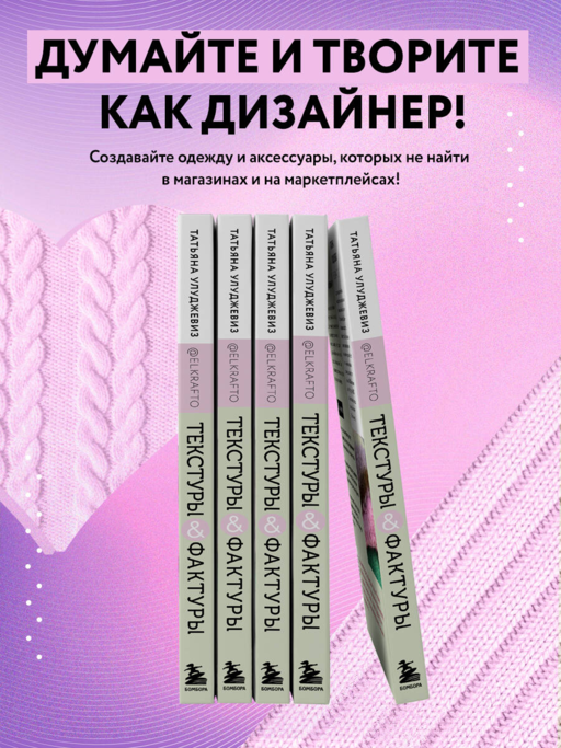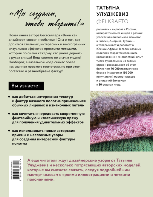 «Вязание — это прежде всего творчество. Разбудите в себе исследователя и не бойтесь экспериментировать! Смешивайте, соединяйте, переплетайте и чередуйте разную по цвету и текстуре пряжу. Ломайте стереотипы!» — так формулирует замечательный мастер Татьяна Улуджевиз идею своей новой необычной книги! Необычна она тем, что предлагает простые и порой неожиданные методы вязания вещей, от которых невозможно отвести глаз, полных дизайнерских находок и уникальных по стилю. И все это не благодаря витиеватым узорам или сложным конструкциям, а благодаря необычной текстуре и фактуре полотна, создать которую невероятно легко, стоит лишь дать волю собственной фантазии. Уроки мастера сделают алгоритм работы с текстурами логичным и понятным.
