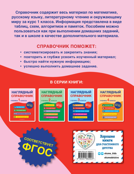 Yardımcı kitap, matematik, Rus dili, edebi okumalar ve çevre bilgisi gibi 1. sınıfta öğretilen temel konuları içerir. Referans ve bilgi materyali tablolar, şemalar, algoritmalar ve notlar şeklinde görsel ve erişilebilir olarak sunulmuştur. Başvuru kitabı, ilköğretim temel eğitimi için son FGOS gerekliliklerine uygun olarak hazırlanmıştır. Öğrenci, bilgilerini sistemleştirmek, geçmiş materyali tekrar etmek ve pekiştirmek, problemli konuları ekstra çalışmak ve bağımsız ve kontrol çalışmaları için hazırlanmak için bu kitap sayesinde faydalanabilir.