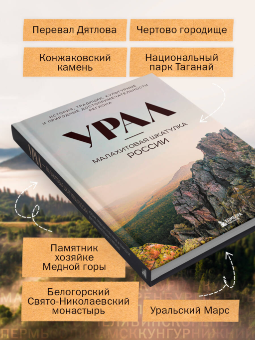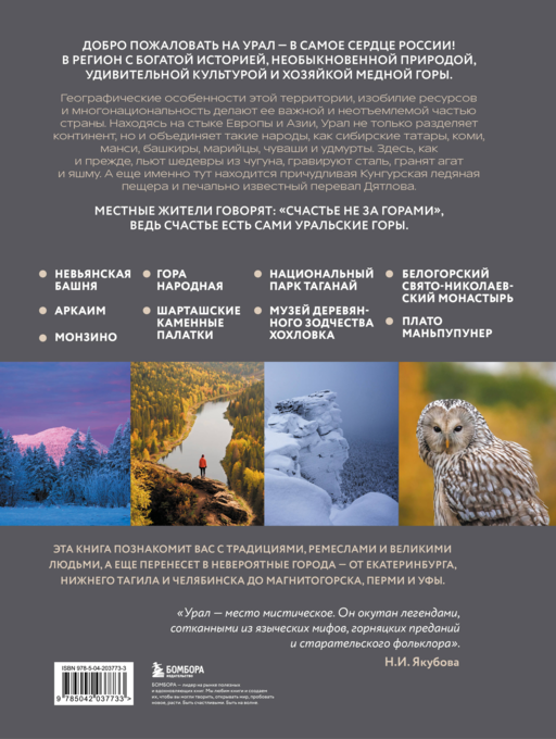 Karşınızda Ural'ın en ilginç yerlerini anlatan bir kitap - meyveler, değerli taşlar, Ural kirpisi, benzersiz mimari anıtlar ve zengin tarih diyarı. Bu bölgenin muhteşem güzellikleri farklı şekillerde keşfedilebilir - kültürel bir ziyaretle eski yerlere, çok sayıda milli parkta yürüyüşe veya yerel tarih keşif gezisine katılarak. Burada sizi bozkırdan dağ tundrasına kadar birden fazla doğa bölgesi karşılayacak. Ulusal park "Yugid Va", Rusya'nın yedi harikasından biri olarak listedeki Manpupuner, Dyatlov geçidi, Konzhakovskiy taşı, Kara şehir kalıntıları gibi unutulmaz yerleri ziyaret edin ve mutlaka Ural Mars'ını görün! “Ural - Rusya'nın Malakit Kutusu” kitabı; ülkesinin tarihini araştırmayı seven ve doğanın şaşırtıcı sırları olmadan hayatını hayal edemeyen herkes için değerli bir hediye olacak.