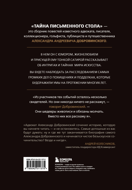 "Yazı Masasının Sırrı", ünlü avukat, yazar, koleksiyoncu, golfçü, gazeteci ve gezgin Aleksandr Andreeviç Dobrovinski'nin bir hikaye koleksiyonudur. Bu kitapta, sanat dünyasının entrikaları ve sırları hakkında esprili, yaşama sevinci dolu ve kendine özgü ince bir hicivle anlatır. Yıllar boyunca zihinleri meşgul eden en gürültülü kaçırma ve sahtecilik davalarının soruşturmalarını izleyeceksiniz. "O olayların katılımcılarından birkaç tanık kaldı. Ama onlar asla bir şey anlatmayacaklar," diyor Dobrovinski. "Onlar resim başyapıtlarıdır ve sessiz kalmak zorundalar. Onların yerine ben anlatacağım." GERİ BİLDİRİM "Avukat Aleksandr Dobrovinski, okumaya başladığınızda bırakamayacağınız bir hikaye yarattı. En titiz olanlarınız düşünecek, peki burada Aleksandr Dobrovinski'nin biyografisi nerede bitiyor ve bilinçsiz kurgu nerede başlıyor. Nerede mi? Her yerde ve hiçbir yerde." — Andrey Ivanovich Kolesnikov, "Rus Pioneri" dergisi baş editörü, "Kommersant" genel müdür yardımcısı