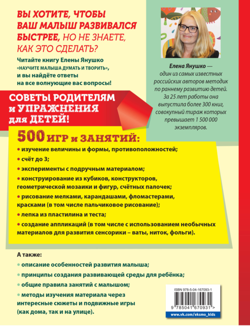 Erken gelişim alanında tanınmış uzman Elena Yanushko'nun kitabı, erken yaş çocuklarının (1-3 yaş arası) dilsel düşünme ve yaratıcı potansiyellerinin gelişimine adanmıştır. Yazar, okuyucuyu çocukların gelişim özellikleriyle tanıştırır ve düşüncelerinin gelişimi için işin başlangıç aşamasını anlatır; farklı oyunlar ve egzersizler sunar, ek materyallerin (bloklardan konstrüktörlere kadar) kullanımını içerir. Kitap, ebeveynler, anaokulu öğretmenleri ve erken gelişim pedagojları için hazırlanmıştır.