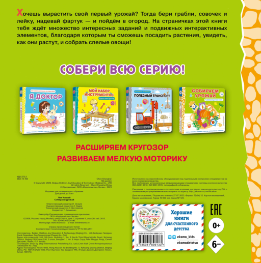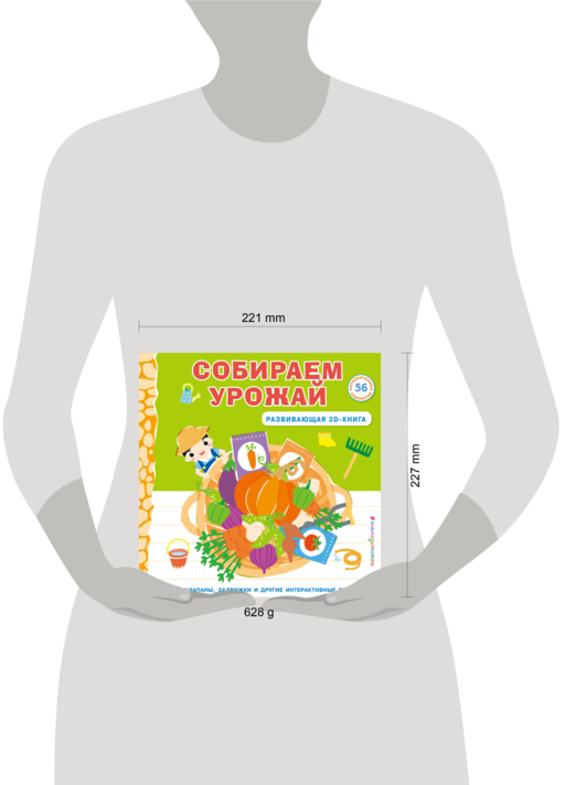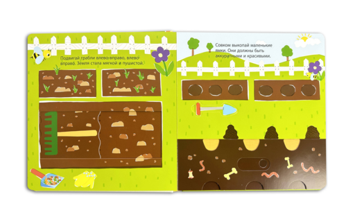 Bir kitapta 56 etkileşimli öğe! Puzzle'lar, kapaklar, hareket ettirilebilen, döndürülebilen, kitaptan çıkarılabilen sürgüler. Dayanıklı ve güvenilir yapı: sert kapak, yuvarlatılmış köşeler, kalın parlak kaplanmış karton sayfalar. Yalnızca güvenli malzemeler! Hasat Zamanı! Çocuklar için son derece eğlenceli 3D kitap — her sayfada interaktif öğeler, çocuğa bitkilerin nasıl büyüdüğünü en iyi şekilde anlatmaya yardımcı olur. İlk hasadını yetiştirmek ister misin? O halde oyuncak kitabını aç, küçük kürek, kürekçik, tırmık al ve işe başla! Sayfalardaki hareketli öğeler sayesinde çukurlar kazabilir, toprağı havalandırabilir, tohumları ekebilir ve sulayabilir, sonunda olgun sebzeleri sepete toplayabilirsin. Artık küçük bir bahçen var. Bu geliştirme kitabı 3-4 yaş çocuklar için mükemmeldir. İnteraktif öğeler ince motor becerilerin gelişimine yardımcı olur. Dünyayı birlikte keşfedelim!