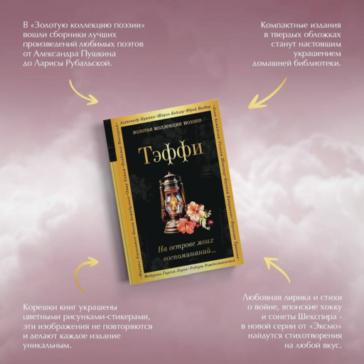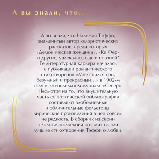 Bu kitapta Teffi'nin en iyi şiir eserleri bir araya getirilmiştir. Öğrenciler, uzmanlar ve yazarın eserlerinin hayranları için uygundur. Teffi'nin şiirsel ve nesir eserleri tüm edebiyat programlarına dahil edilmiştir.