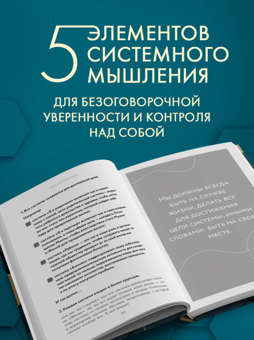 Evgenia Pavlovskaya'nın yeni kitabı — yazarın 10 kitabından ilki, geniş kitlelere ulaşan. Uzun süre Pavlovskaya'nın yenilikleri sadece seçilmiş birkaç okuyucuya açıktı. Şimdi ise herkes sistemli düşünmenin temelleriyle tanışabilir, bunları hayatta uygulamaya başlayarak kişisel ve finansal hedeflere kolayca ulaşabilir. Sistemli düşünme sayesinde dünyamızın dilini anlayacak, onun ne kadar erişilebilir ve anlaşılır olduğunu kavrayacaksınız. Kendi yaşamınızı yönetmenin temelini oluşturan 5 öğeyi öğrenecek, her durumdan fayda sağlamayı ve sistemli çözümlerle her zaman kendi yararınıza seçim yapmayı başaracaksınız. Kendini sevmenin ne demek olduğunu sadece sözde değil, eylemde anlayacak, kendinize nasıl iyi bakacağınızı öğrenerek başkalarına da sevgi sunacaksınız. "Burada ve şimdi" yaşamayı, kendi tepkilerinizi bilip kontrol etmeyi, kendi yaşam ilkelerinizi oluşturmayı öğreneceksiniz; bu, hayatınızı başkalarının görüşlerine bakmadan yaşamanıza imkan sağlayacak. Duygularınızı, düşüncelerinizi ve hatta korkularınızı seveceksiniz. Bunların yeni bilgilerle doğrudan bağlantılı olduğunu anlayacak, kendinize ve hayatınıza dikkatle ve bilinçli yaklaşmayı öğreneceksiniz. Bu dünyanın sırlarına nüfuz edecek ve hayata dair hiçbir sorunuz kalmayacak. Sadece sizi kendi hayatınız üzerinde tam kontrol ve koşulsuz mutluluğa götüren cevaplar olacak.