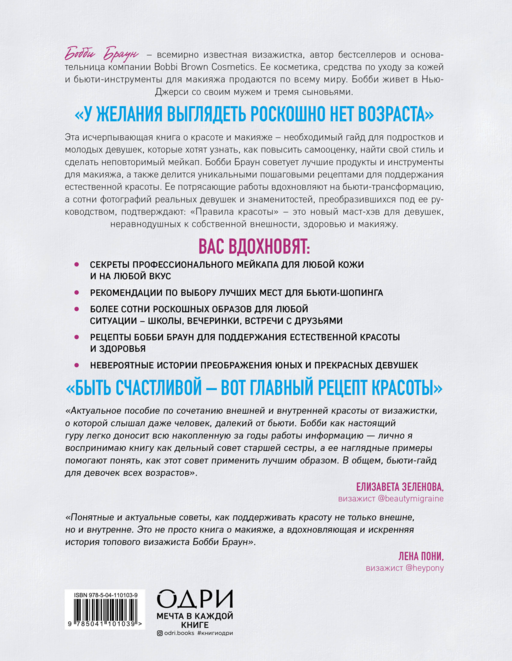 Bobbi Brown — dünya çapında tanınan makyaj sanatçısı, çok satanların yazarı ve Bobbi Brown Cosmetics'in kurucusu. Kozmetik ürünleri, cilt bakım ürünleri ve makyaj için güzellik araçları tüm dünyada satılıyor. Bobbi, New Jersey'de kocası ve üç oğlu ile yaşıyor. "GÖSTERİŞLİ GÖRÜNMEK İSTEĞİNİN YAŞI YOKTUR." Bu kapsamlı güzellik ve makyaj kitabı — özgüvenini artırmak, stilini bulmak ve benzersiz makyaj yapmak isteyen gençler ve genç kızlar için gerekli bir rehberdir. Bobbi Brown en iyi makyaj ürünleri ve araçlarını öneriyor, ayrıca doğal güzelliğin korunması için eşsiz adım adım tarifler paylaşıyor. Onun muhteşem çalışmaları güzellik dönüşümü için ilham verir ve yönetiminde değişen gerçek kızlar ve ünlülerin yüzlerce fotoğrafı "Güzellik Kuralları"nın, kendi dış görünüşüne, sağlığına ve makyajına önem veren kızlar için yeni bir olmazsa olmaz olduğunu kanıtlar. İlham alacaksınız: - Her cilt ve zevke uygun profesyonel makyaj sırları; - En iyi güzellik alışveriş yerleri için öneriler; - Okul, parti, arkadaş buluşması gibi her durum için yüzlerce şık görünüm; - Bobbi Brown'dan doğal güzellik ve sağlığı koruma tarifleri; - Genç ve güzel kızların inanılmaz dönüşüm hikayeleri. "MUTLU OLMAK, GÜZELLİĞİN EN ÖNEMLİ TARİFİDİR."