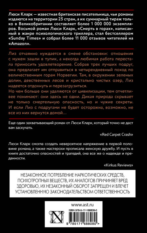 — "Suçlu Deniz", "Adada Cinayet" ve "Benim Yabancı Evim" romanlarının yazarı. — Lucy Clarke, kitapları 25 dile çevrilen ve sadece Birleşik Krallık'ta bir milyondan fazla satan tanınmış İngiliz yazardır. — Lucy Clarke'ın iki romanı televizyon için uyarlanmıştır, üçü ise çekim aşamasındadır. — "Dağlarda Ölüm", dağlarda hayatta kalma ve kadın arkadaşlığı üzerine heyecan verici bir psikolojik gerilim romanıdır.