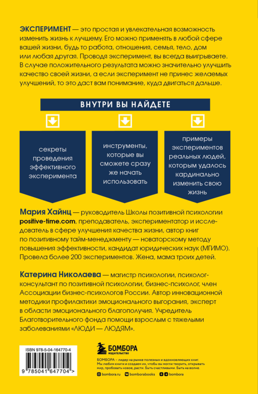 Deney, hayatınızı daha iyiye değiştirmek için basit ama eğlenceli bir fırsattır. İş, ilişkiler, aile, beden, ev veya başka herhangi bir alanda uygulanabilir. Deney yaparken her zaman kazanırsınız. Olumlu sonuç alınırsa hayat kalitenizi önemli ölçüde artırabilirsiniz; eğer deney istenen iyileşmeyi getirmezse, bu size nerede ilerleyeceğiniz konusunda anlayış kazandırır. İçeride etkili deney yapmanın sırları, hemen kullanmaya başlayabileceğiniz egzersizler ve hayatını kökten değiştirmeyi başaran gerçek insanların deneyimleri bulunmaktadır! YAZARLAR HAKKINDA: Maria Heinz — Pozitif Psikoloji Okulu yöneticisi https://positive-time.com, öğretmen, deneyci ve yaşam kalitesini artırma alanında araştırmacı, kitap yazarı ve pozitif zaman yönetiminde yenilikçi yöntem geliştiricisi, hukuk doktora adayı (MGIMO). 200'den fazla deney gerçekleştirdi. Eşi ve üç çocuk annesi. Ekaterina Nikolaeva — Psikoloji yüksek lisans mezunu, pozitif psikoloji danışmanı, işletme psikoloğu, Rusya İşletme Psikologları Derneği üyesi. Duygusal tükenmişlik önleme alanında yenilikçi metodun yazarı, duygusal esenlik uzmanı. Ağır hastalıklı yetişkinlere yardım eden "İnsanlardan İnsanlara" Yardım Vakfı kurucusu.