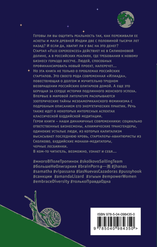 UYUŞTURUCU MADDELERİN, PSİKOTROP MADDELERİN VE ANALOGLARININ YASADIŞI KULLANIMI SAĞLIĞA ZARAR VERMEKTE, YASADIŞI TİCARETİ YASALARCA YASAKLANMIŞTIR VE HUKUKİ SORUMLULUK DOĞURUR. Antik Hindistan'ın keşiş ve büyücüleri gibi gerçekliği iki buçuk bin yıl önce deneyimlemeye hazır mısınız? Eğer hazırsanız, bunun için yeterli paranız var mı? “Fuji experiences” girişimi Silikon Vadisi'nde değil, Rusya'nın daha zorlu iş ortamındadır. Yeni projeleri finanse edebilecek kişi çok az… Ancak bu kitap sadece Rus girişimcilerin sorunlarıyla ilgili değil. Rus oligarklarının eve dönüşünün uzun ve zorlu hikayesidir. Ayrıca gerçek bir kadın başarısının kalpleri sarsan hikayesidir. İlk kez dünya edebiyatında, Mesoamerikan feminizminin ezoterik sırları ve enerji uygulamalarının ayrıntılı anlatımı sunuluyor. Ayrıca klasik Budist meditasyonunun bazı ilginç yönlerine değiniliyor. Kitabın kahramanları çağdaş, dinamik insanlar: sosyal sorumluluk sahibi işadamları, kapitalizmin son kanlarını emdiği yalnız ve yorgun bireyler, Skolkovo'dan maceraperest girişimciler, Budist rahip meditasyoncular. Okuyucu kendinden bir şeyler bulabilir…