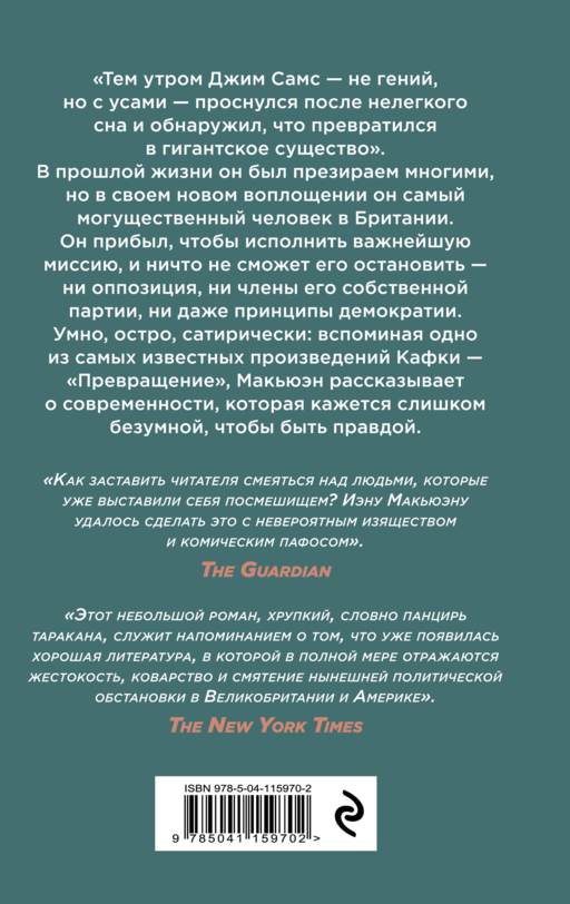 Kafka'nın klasik eseri “Dönüşüm”ü bilmeyen var mı? Ve yetenekli İngiliz yazar Ian McEwan'ı tanımayan biri var mı? Yeni eseri “Hamam Böceği”nde McEwan, bir sabah aniden İngiltere Başbakanı'na dönüşen bir böceğin hikayesini anlatıyor. Artık önünde önemli bir görev var: halkın çıkarları için mücadele etmek. Modern gerçeklik üzerine keskin bir hiciv olan bu kitap, okuyucuda hem kahkaha hem de gözyaşı uyandıracak kadar etkileyici.