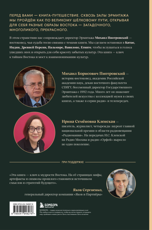 Ermitaj Müzesi Müdürü Mihail Piotrovsky ve kültür üzerine radyo programları sunucusu ünlü İrina Klenskaya sizi Doğu'nun kadim krallıkları boyunca bir yolculuğa davet ediyor. Ermitaj salonlarında dolaşırken, Çin porselenlerine, İran halılarına, Hint heykelciklerine bakarken, geçmişin canlandığını hissedeceksiniz. Güçlü kraliçeler Kleopatra ve Semiramis ile ilgili efsaneleri öğrenecek, antik Palmira, Babil, Mısır, Çin, Pers topraklarını ziyaret edecek — Avrupalı gezginleri cezbeden ve ilham veren o Doğu'yu hissedeceksiniz.