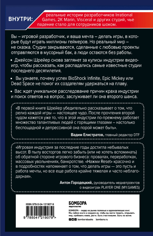 İçeride: Irrational Games, 2K Marin, Visceral ve diğer stüdyolardan gerçek geliştirici hikayeleri, çöküşleri çalışanlar için şok oldu. Siz bir oyun geliştiricisiniz ve hayaliniz milyonlarca oyuncunun oynayacağı oyunlar yapmak. Ama gerçek dünya bir masal değil. Stüdyolar kapanıyor, sevgiyle yapılan projeler çöpe gidiyor ve insanlar işsiz kalıyor. - Jason Schreier, video oyun endüstrisinin perde arkasını yeniden inceleyerek son on yıldaki en tanınmış stüdyoların nasıl dağılmasını anlatacak. - BioShock Infinite, Epic Mickey veya Dead Space'in başarılarının yaratıcılarının ayakta kalmasına neden yardımcı olmadığını öğreneceksiniz. - Endüstrinin çöküş nedenleri üzerine benzersiz bir soruşturma ve ikinci şansı hak edip etmediğine dair cevap arayışınız olacak. “Schreier ilk kitabında her oyunun çıkışının gerçek bir mucize olduğunu etkileyici biçimde anlatıyor. İkinci kitabı okuduktan sonra ise, bu endüstride hâlâ parlayan gözlerle çalışan çok sayıda yetenekli insanın var olması bir mucize gibi görünüyor — çünkü bazen bu sektör ne kadar acımasız ve depresif olabilir.” — Vadim Yelistratov, DTF Baş Editörü "Oyun endüstrisi son yıllarda hiç olmadığı kadar yükseğe çıktı. Coşku içinde oyun işinin kötü yanlarını — başarısızlıkları, fazla mesaileri, kitlesel işten çıkarmaları, iflasları — unutmamız veya anmak istememiz kolay. 'Sıfırlamak için Reset Tuşuna Bas' canlı ve detaylı şekilde hatırlatıyor ki oyun yapmak rüya işi olsa da hâlâ ağır ve çoğu zaman karşılıksız bir iştir.” — Anton Gorodetsky, oyuncu medyası projesi PLAYER ONE (MY.GAMES) yöneticisi