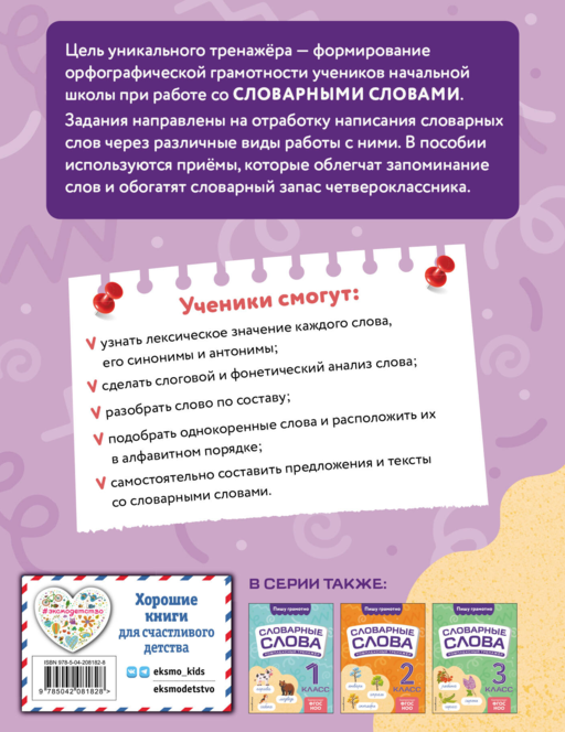 «Eksmo» yayınevinden Rus dili antrenörü, 4. sınıf öğrencilerinin sözlük kelimelerinin yazımını öğrenmelerine yardımcı olur. Çeşitli görevler sayesinde sözlük kelimeleri öğrencinin hafızasında sonsuza kadar "çakılır" ve yazılı çalışmalarında asla hata yapmaz. Bu yöntemin etkinliği önde gelen uzmanlar tarafından doğrulanmıştır. İlköğretim genel eğitim için son FSES (Federal Devlet Eğitim Standartları) gereksinimleri ile tamamen uyumlu olarak geliştirilmiştir.