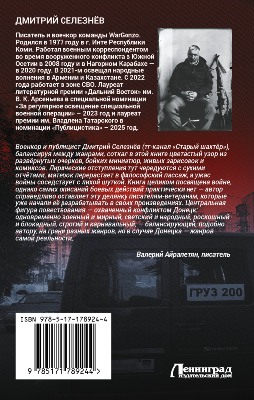 – Vladlen Tatarski'nin adıyla ödüllendirilmiş savaş muhabiri Dmitriy Seleznyov'un belgesel düzyazısı ve WarGonzo projesinin ses getiren raporlarının yazarı. – Donetsk, Soledar, Popasna, Bahmut'ta yaşanmış gerçek hikayeler. – Kitabın sayfalarında bombardıman altındaki şehirde kalan insanların sesleri. – Gözlemci tarafından yazılmış dürüst metin – propaganda olmadan, süslemeden, ayakta kalan herkese saygıyla. – Belgesel edebiyat, raporlar ve çağdaş düzyazı seven, gerçeği arayan okuyucular için. – “Zaman Z” serisinin bir parçasıdır – ateş hattında yaşayan neslin gücüne, anısına ve ödediği bedellere dair kitaplar.
