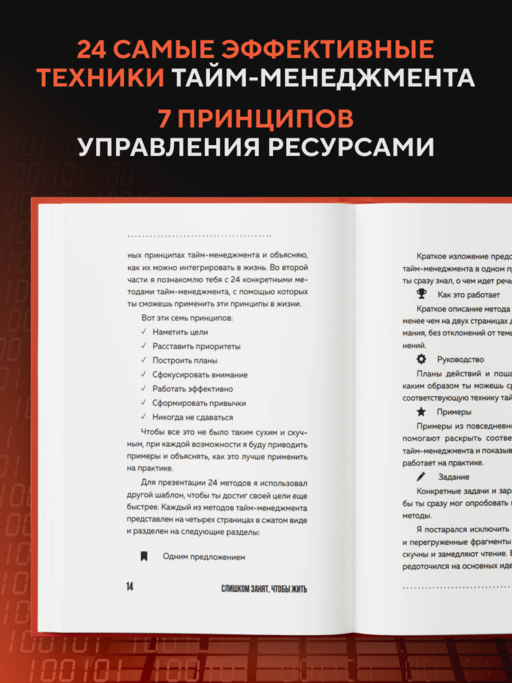 Bu kitapta en etkili 24 zaman yönetimi tekniği bir araya getirildi. Yazar, bilim insanı ve girişimci Tim Reichel, uzun yıllara dayanan araştırmalar temelinde “çalışmak için yaşamak değil, yaşamak için çalışmak” anlayışını gerçekten destekleyen metotları ortaya koydu. Ayrıca kitabında, acele etmeden her şeyi başarmaya yardımcı olan etkili kaynak yönetiminin 7 ilkesinden bahsediyor. Kitaptan öğreneceksiniz: - Hızlıca faydalı alışkanlıklar nasıl edinilir; - Planlar nasıl uygulanır şekilde yapılır; - Dikkatinizi nasıl yoğunlaştırırsınız; - Eleştirel düşünce nasıl geliştirilir.