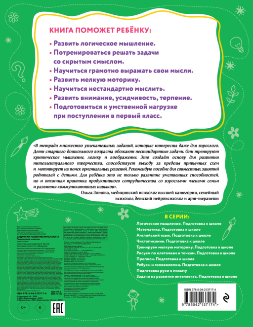Эта книга для детей от 5 лет поможет дошкольнику развить когнитивные функции мозга, логическое, критическое и творческое мышление. Это поможет ему легко адаптироваться к большой умственной нагрузке при поступлении в первый класс. В рабочей тетради более 365 задач на развитие интеллекта, рассчитанных на каждый день года. Это способствует равномерному распределению учебной нагрузки и формированию положительного отношения ребёнка к обучению в школе. Дошкольник потренируется решать задачи со скрытым смыслом, отвечать на каверзные вопросы, самостоятельно рассуждать, сравнивать, анализировать и делать выводы. Он научится грамотно выражать свои мысли, станет внимательным, аккуратным, самостоятельным и приобретёт другие важные навыки, необходимые при обучении в школе.